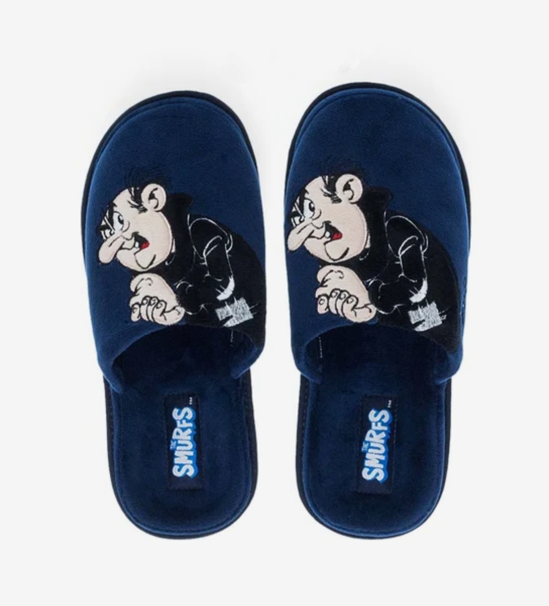 Ανδρικές παντόφλες σπιτιού Smurf. Γκρι και μπλε ανδρικές παντόφλες με σχέδιο Δρακουμέλ από τα Στρουμφάκια, ιδανικές για τους λάτρεις των comics και για άνεση στο σπίτι.